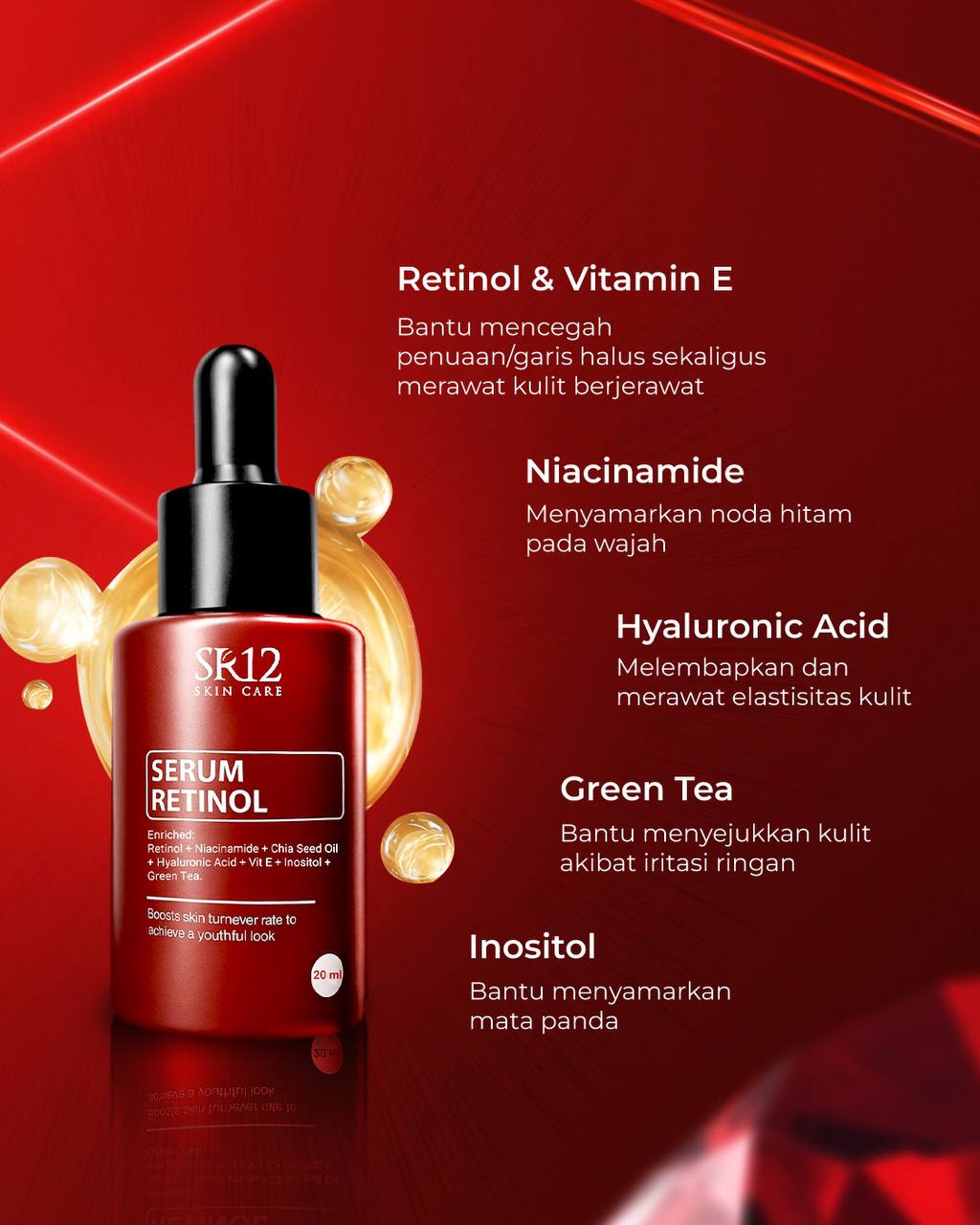 Jangan biarkan kerutan mencuri pesonamu! SR12 Serum Retinol bekerja efektif untuk menyamarkan garis halus dan kerutan, menjadikan kulit tampak lebih segar dan awet muda
